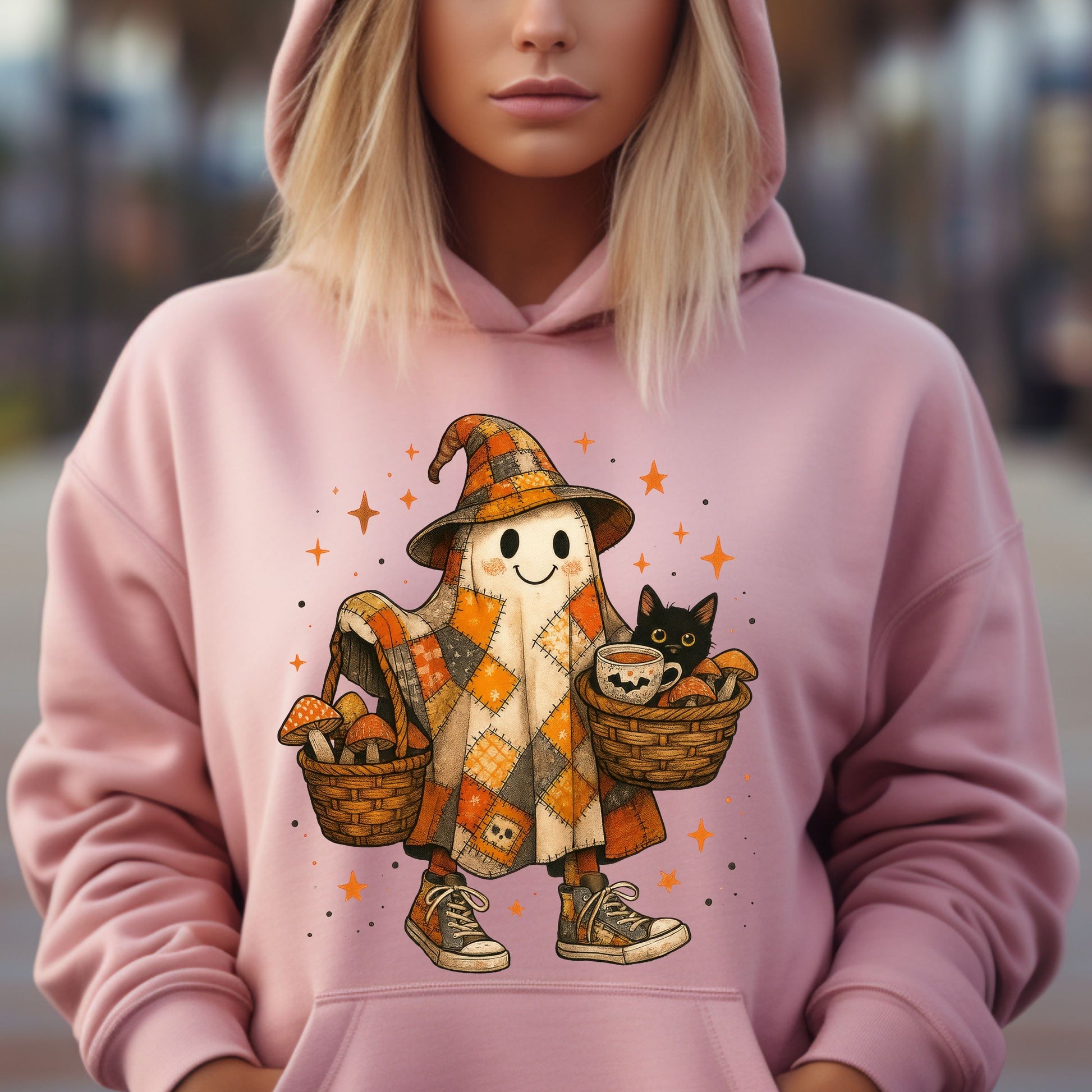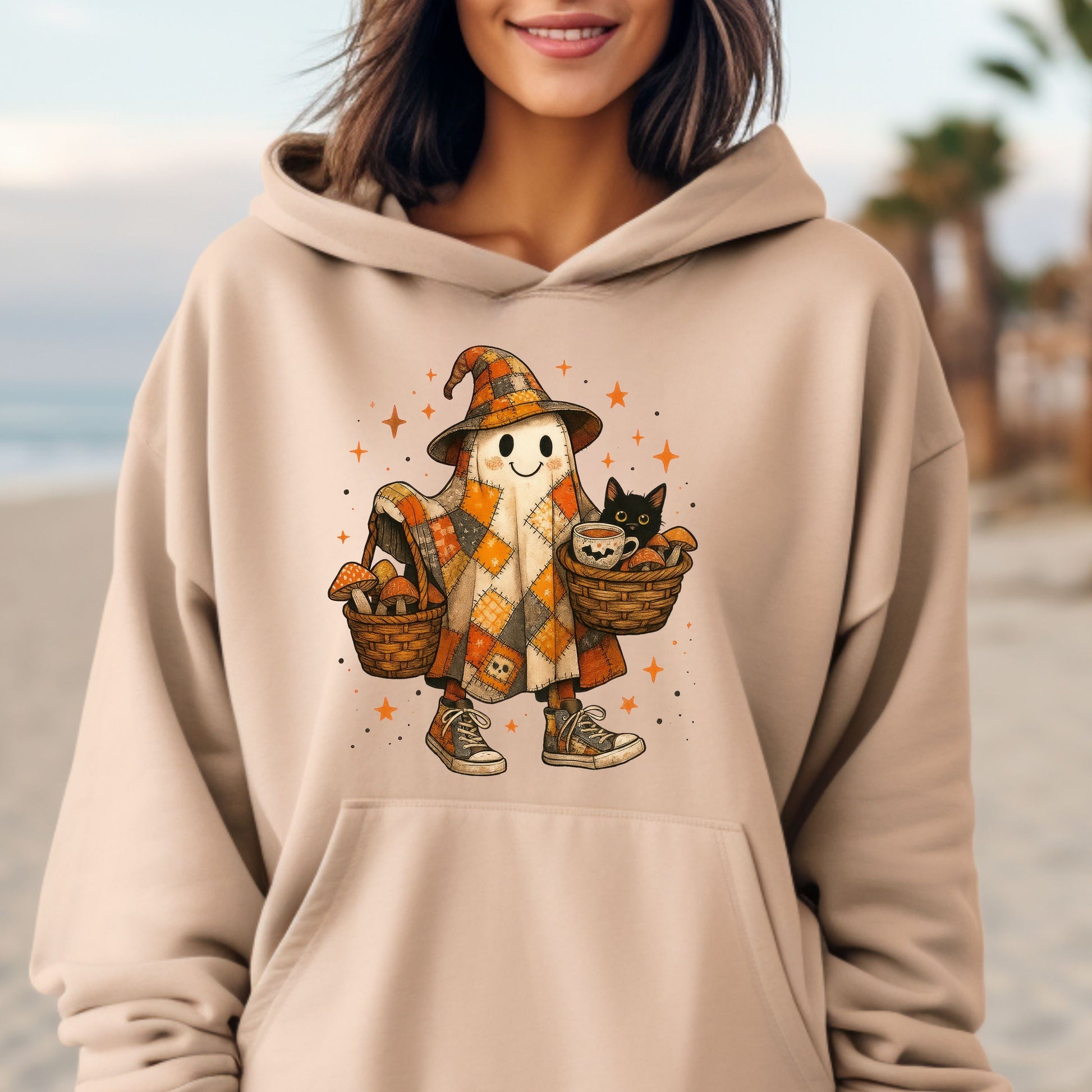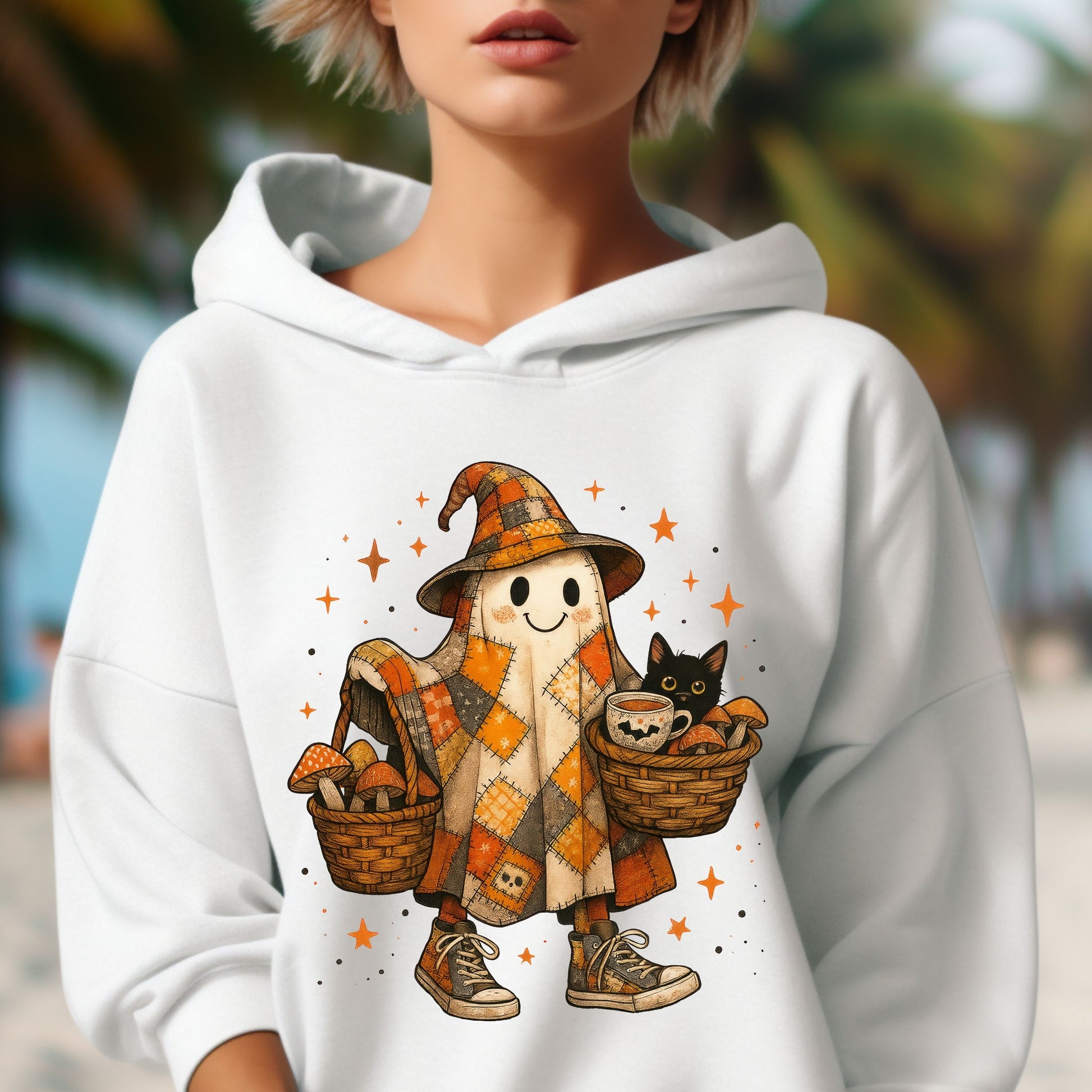 Halloween Ghost Hoodie, Patchwork Ghost Hoodie, Cottagecore Halloween Hoodie, Rustic Halloween Ghost hoodie, Black Cat hoodie
